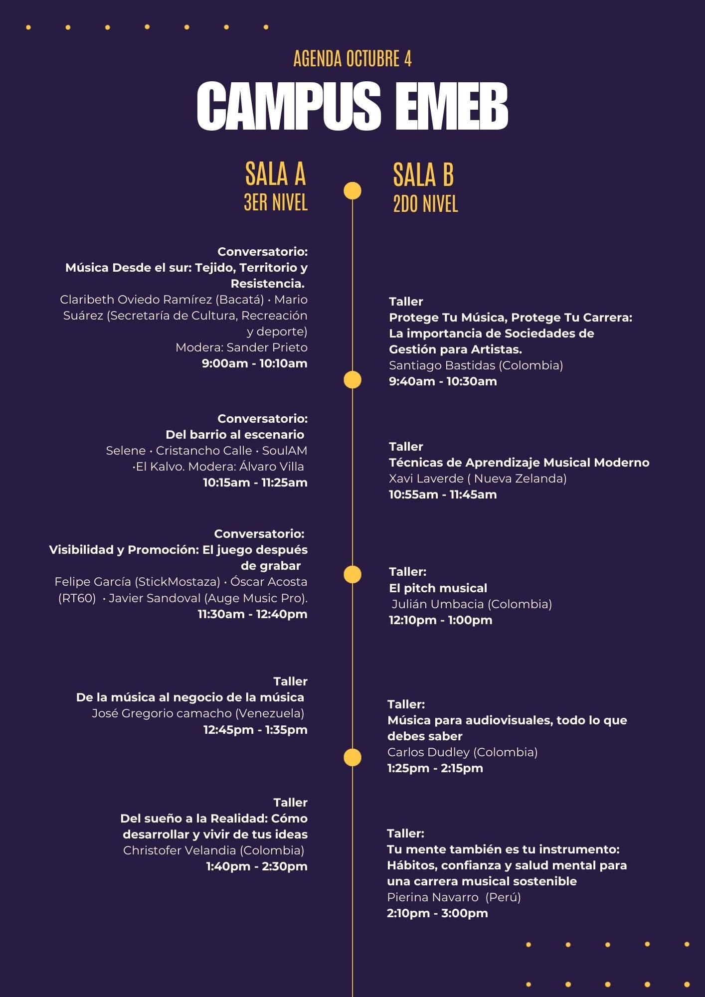 El Campus EMEB son encuentros virtuales y presenciales con conversatorios, charlas y talleres especializados impartidos por profesionales de la industria musical. Entérate de la agenda del sábado 4 de Octubre